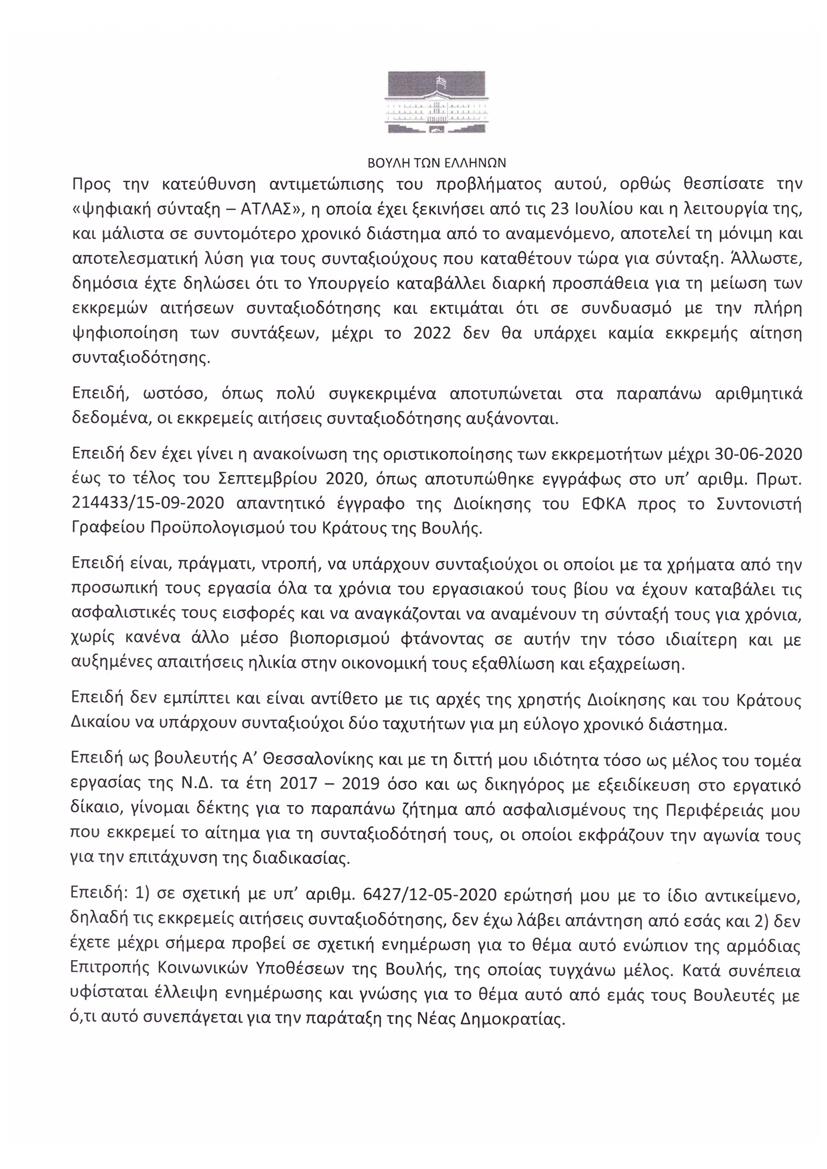 Επειδή: 1) σε σχετική με υπ’ αριθμ. 6427/12-05-2020 ερώτησή μου με το ίδιο αντικείμενο, δηλαδή τις εκκρεμείς αιτήσεις συνταξιοδότησης, δεν έχω λάβει απάντηση από εσάς και 2) δεν έχετε μέχρι σήμερα προβεί σε σχετική ενημέρωση για το θέμα αυτό ενώπιον της αρμόδιας Επιτροπής Κοινωνικών Υποθέσεων της Βουλής, της οποίας τυγχάνω μέλος. Κατά συνέπεια υφίσταται έλλειψη ενημέρωσης και γνώσης για το θέμα αυτό από εμάς τους Βουλευτές με ό,τι αυτό συνεπάγεται για την παράταξη της Νέας Δημοκρατίας».
