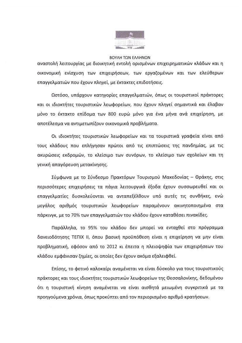 Η βουλευτής τονίζει ότι οι ιδιοκτήτες τουριστικών λεωφορείων και τα τουριστικά γραφεία είναι από τους κλάδους που επλήγησαν πρώτοι από τις επιπτώσεις της πανδημίας, με τις ακυρώσεις εκδρομών, το κλείσιμο των συνόρων, το κλείσιμο των σχολείων και τη γενική απαγόρευση μετακίνησης.