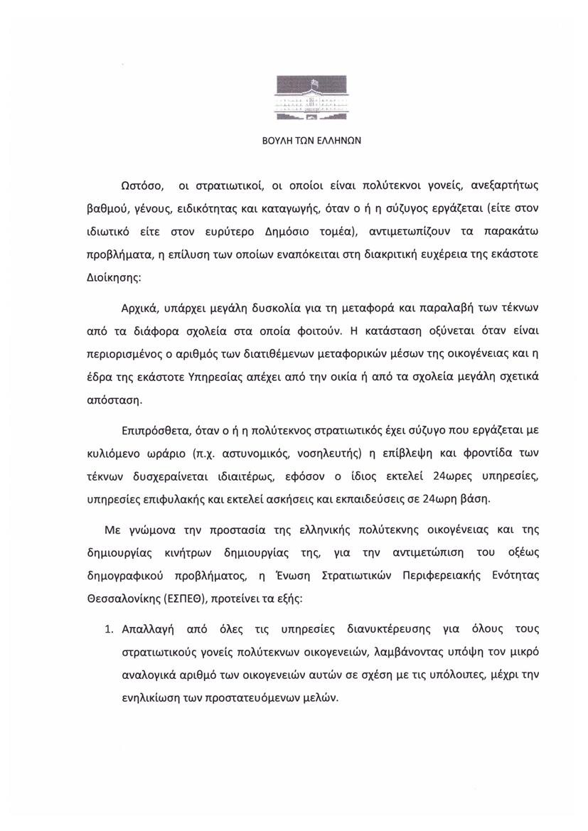 Όπως αναφέρει η βουλευτής οι στρατιωτικοί, οι οποίοι είναι πολύτεκνοι γονείς, ανεξαρτήτως βαθμού, γένους, ειδικότητας και καταγωγής, όταν ο/η σύζυγος εργάζεται (είτε στον ιδιωτικό, είτε στον ευρύτερο δημόσιο τομέα), αντιμετωπίζουν τα παρακάτω προβλήματα, η επίλυση των οποίων εναπόκειται στη διακριτική ευχέρεια της εκάστοτε Διοίκησης: