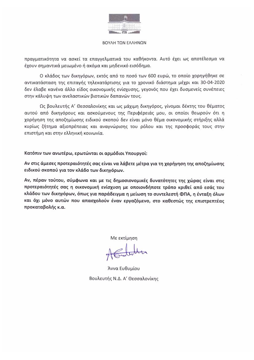 Η Άννα Ευθυμίου επισημαίνει ότι ο κλάδος των δικηγόρων δεν έλαβε κανένα άλλο είδος οικονομικής ενίσχυσης εκτός από το ποσό των 600 ευρώ, το οποίο χορηγήθηκε σε αντικατάσταση της επιταγής τηλεκατάρτισης για το χρονικό διάστημα μέχρι και 30-04-2020, γεγονός που έχει δυσμενείς συνέπειες στην κάλυψη των ανελαστικών βιοτικών δαπανών τους.