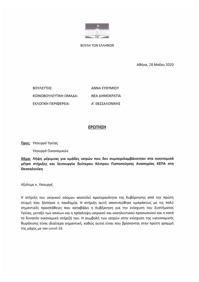 Ερώτηση στη Βουλή κατέθεσε η βουλευτής Α΄ Θεσσαλονίκης, Άννα Ευθυμίου, αναφορικά με τη λήψη μέριμνας ομάδες ιατρών που δεν συμπεριλαμβάνονταν στα οικονομικά μέτρα στήριξης και για τη λειτουργία δεύτερου Κέντρου Πιστοποίησης Αναπηρίας (ΚΕΠΑ) στη Θεσσαλονίκη.