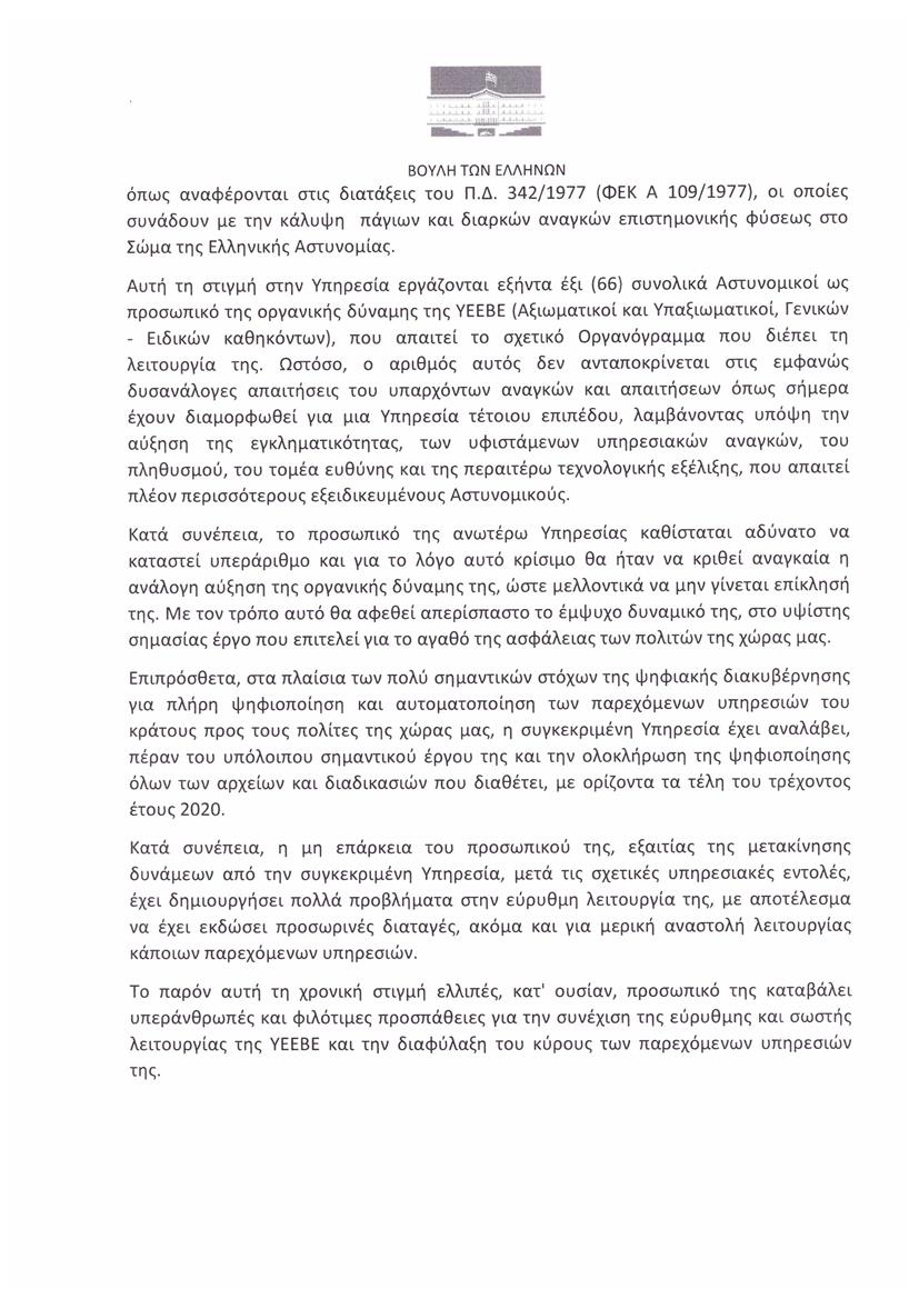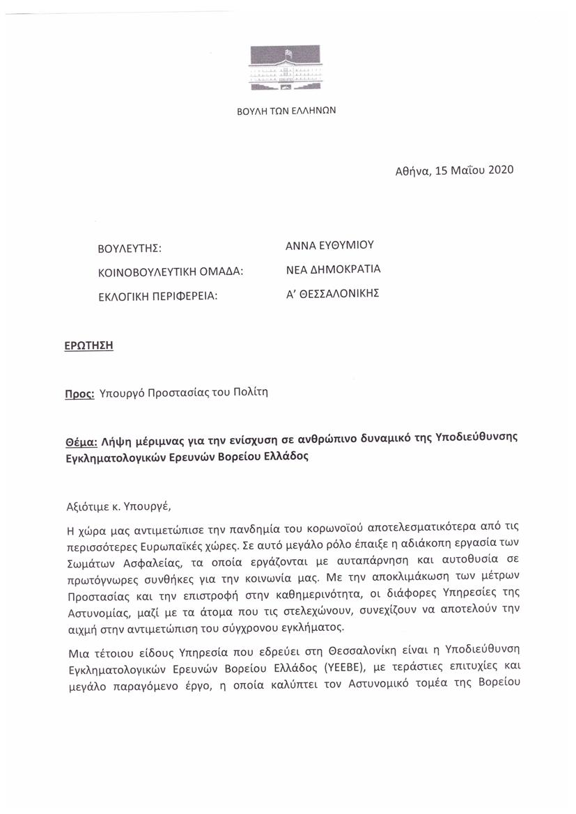 Ερώτηση στη Βουλή κατέθεσε η βουλευτής Α΄ Θεσσαλονίκης, Άννα Ευθυμίου, αναφορικά με την ενίσχυση σε ανθρώπινο δυναμικό της Υποδιεύθυνσης Εγκληματολογικών Ερευνών Βορείου Ελλάδος.
