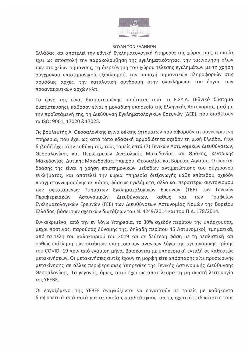 Σύμφωνα με τη βουλευτή, η συμβολή των Σωμάτων Ασφαλείας επιτέλεσε σημαντικό ρόλο στην αντιμετώπιση της πανδημίας του covid-19, ενώ εξακολουθούν, με την αποκλιμάκωση των μέτρων, να αποτελούν την αιχμή στην αντιμετώπιση του συγχρόνου εγκλήματος. Στο πλαίσιο αυτό, αξιέπαινο είναι το έργο της Υποδιεύθυνσης Εγκληματολογικών Ερευνών Βορείου Ελλάδος (ΥΕΕΒΕ), που χρησιμοποιεί επιστημονικές μεθόδους αντιμετώπισης του συγχρόνου εγκλήματος, αποτελεί την κύρια Υπηρεσία διεξαγωγής κάθε επιπέδου σχεδόν πραγματογνωμοσύνης σε πάσης φύσεως εγκλήματα, και σημειώνει σημαντικές επιτυχίες. Η εδαφική της αρμοδιότητα εκτείνεται σε επτά Γενικές Αστυνομικές Διευθύνσεις: Θεσσαλονίκης και Περιφερειών Ανατολικής Μακεδονίας και Θράκης, Κεντρικής Μακεδονίας, Δυτικής Μακεδονίας, Ηπείρου, Θεσσαλίας και Βορείου Αιγαίου. Το έργο της είναι διαπιστευμένης ποιότητας από το Ε.ΣΥ.Δ. (Εθνικό Σύστημα Διαπίστευσης), καθόσον είναι η μοναδική υπηρεσία της Ελληνικής Αστυνομίας, μαζί με την προϊστάμενή της, τη Διεύθυνση Εγκληματολογικών Ερευνών (ΔΕΕ), που διαθέτουν τα ISO: 9001, 17020 &17025. Επίσης, η συγκεκριμένη Υπηρεσία έχει αναλάβει την ολοκλήρωση της ψηφιοποίησης όλων των αρχείων και διαδικασιών που διαθέτει, με ορίζοντα τα τέλη του τρέχοντος έτους.