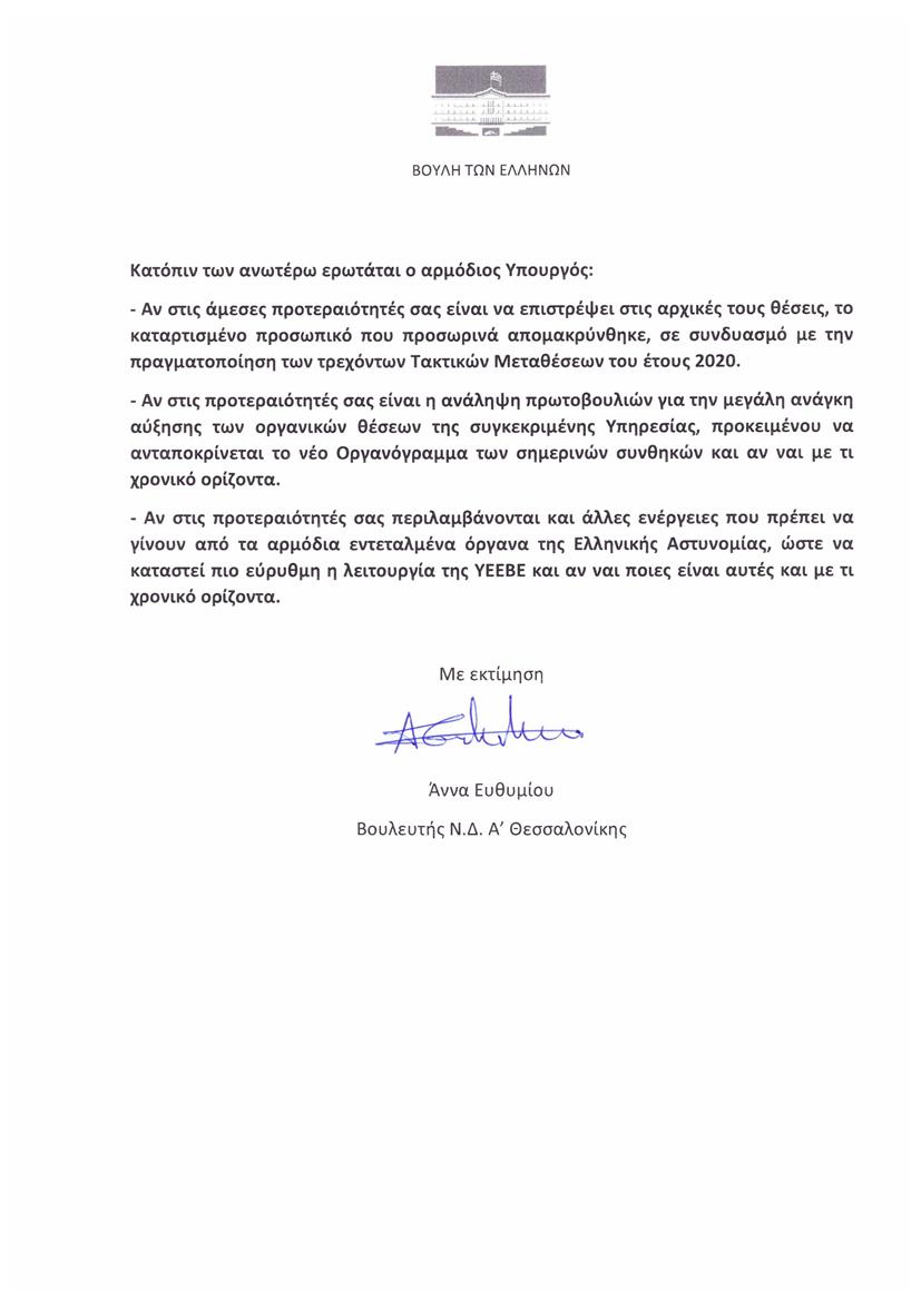 Λαμβάνοντας υπόψιν τα παραπάνω, η Άννα Ευθυμίου θέτει στον Υπουργό Προστασίας του Πολίτη τα εξής ερωτήματα: