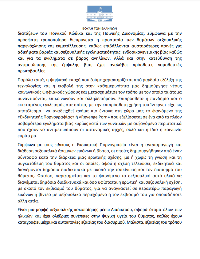 - Αν είναι στις άμεσες προτεραιότητές τους η τροποποίηση του υπάρχοντος νομοθετικού πλαισίου (ν. 4855/2021), για την ποινική μεταχείριση της εκδικητικής πορνογραφίας ως αυτόνομο σεξουαλικό αδίκημα.