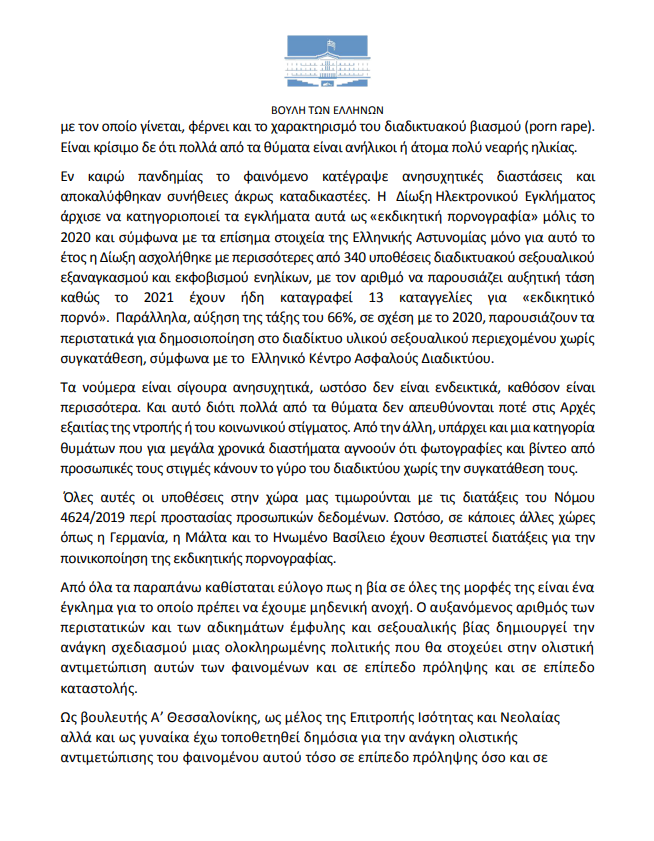 Ερώτηση στη Βουλή, για την τροποποίηση του υπάρχοντος νομοθετικού πλαισίου (ν. 4855/2021), για την αντιμετώπιση της εκδικητικής πορνογραφίας ως αυτόνομο σεξουαλικό αδίκημα, κατέθεσε η βουλευτής Α’ Θεσσαλονίκης, Άννα Ευθυμίου, η οποία ασχολείται συστηματικά με τα θέμα αυτό.