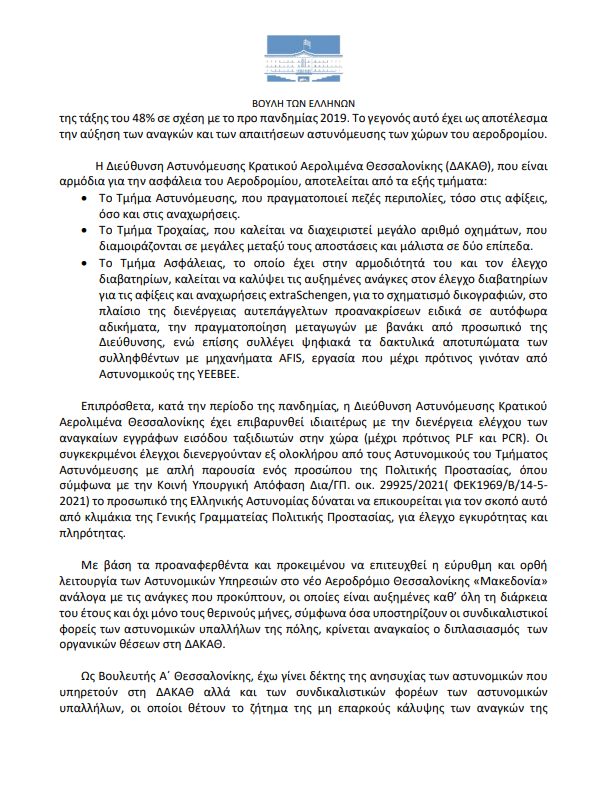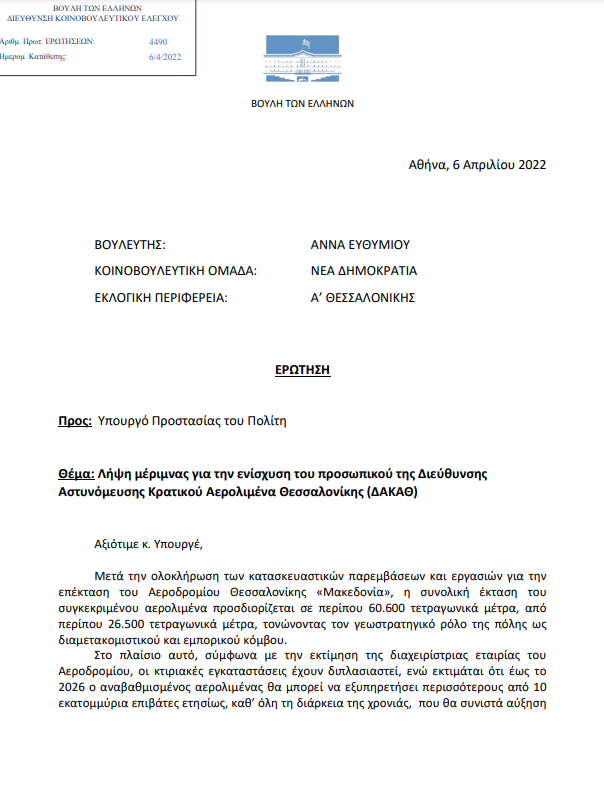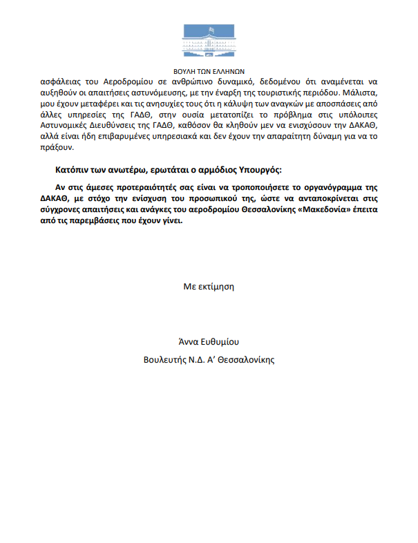Η Άννα Ευθυμίου, βουλευτής Α΄ Θεσσαλονίκης, κατέθεσε ερώτηση στη Βουλή αναφορικά με την ενίσχυση του προσωπικού της Διεύθυνσης Αστυνόμευσης Κρατικού Αερολιμένα Θεσσαλονίκης (ΔΑΚΑΘ)