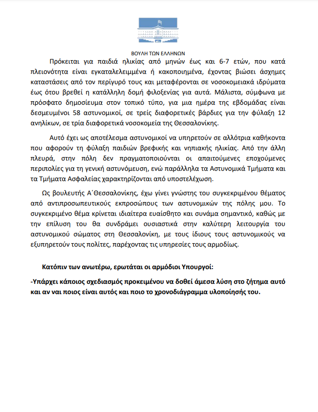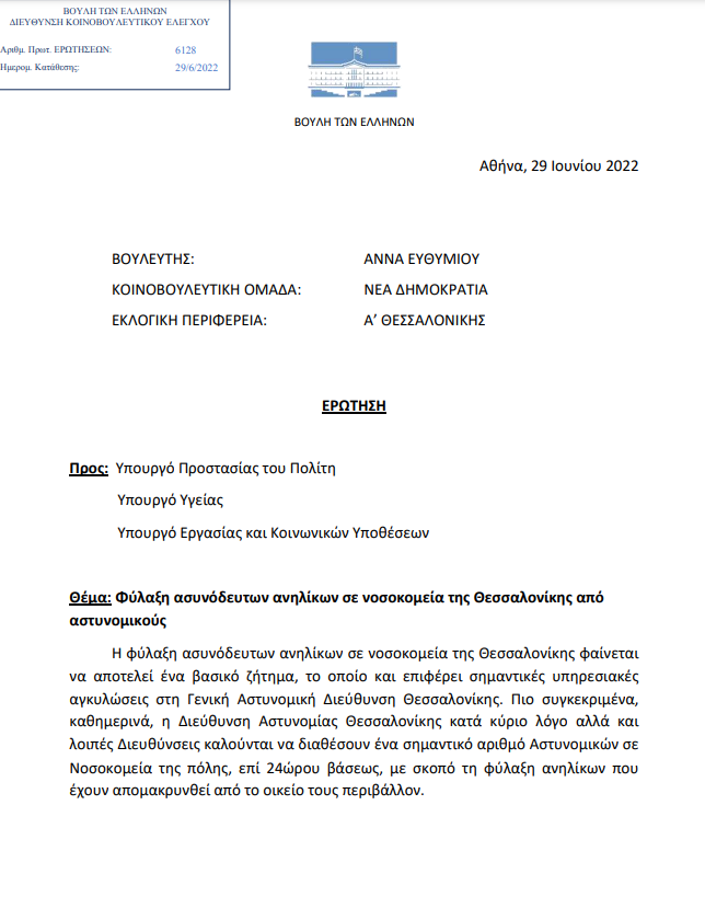 Η Άννα Ευθυμίου, βουλευτής Α΄ Θεσσαλονίκης, κατέθεσε ερώτηση στη Βουλή αναφορικά με τα ασυνόδευτα ανήλικα στα νοσοκομεία της Θεσσαλονίκης.