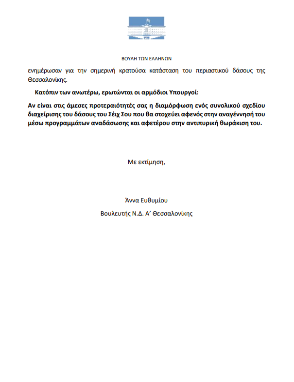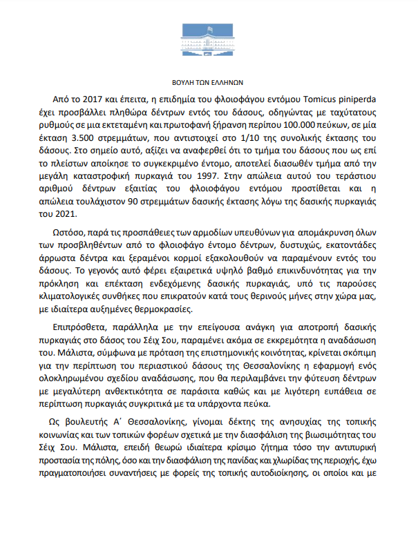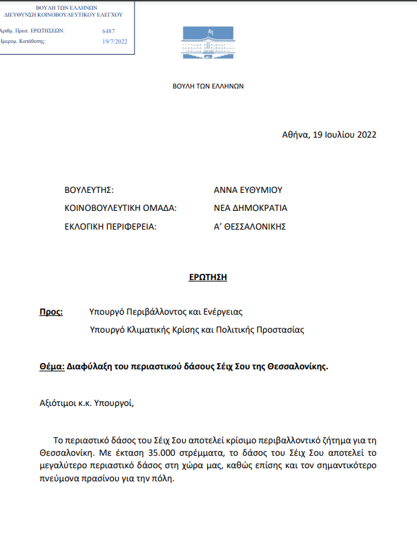 «Ως βουλευτής Α΄ Θεσσαλονίκης, γίνομαι δέκτης της ανησυχίας της τοπικής κοινωνίας και των τοπικών φορέων σχετικά με τη θωράκιση του Σέιχ Σου ενόψει της αντιπυρικής περιόδου. Μάλιστα, επειδή θεωρώ ιδιαίτερα κρίσιμο ζήτημα τόσο την αντιπυρική προστασία της πόλης, όσο και την διασφάλιση της πανίδας και χλωρίδας της περιοχής, έχω πραγματοποιήσει συναντήσεις με φορείς της τοπικής αυτοδιοίκησης και θεσμικούς φορείς, οι οποίοι και με