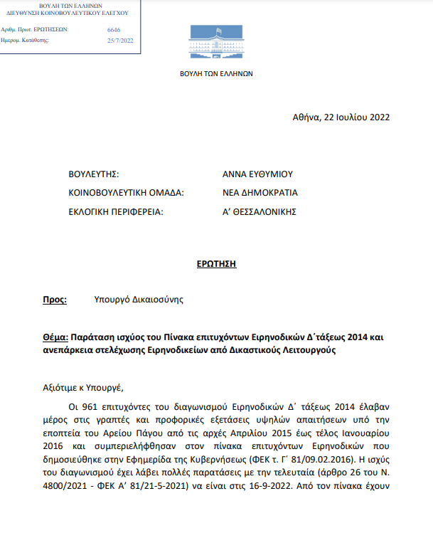 εάν είναι στις άμεσες προτεραιότητές σας η τοποθέτηση όλων των επιτυχόντων Ειρηνοδικών του εν ισχύ πίνακα (ΦΕΚ τ. Γ΄ 81/09.02.2016) με σκοπό της ταχύτερη απονομή της Δικαιοσύνης.