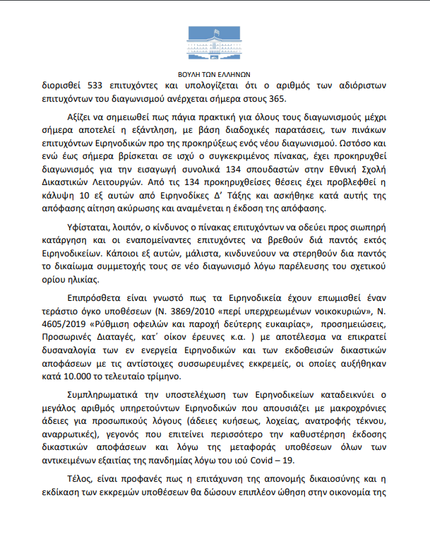 Υφίσταται, λοιπόν, ο κίνδυνος ο πίνακας επιτυχόντων να οδεύει προς σιωπηρή κατάργηση και οι εναπομείναντες επιτυχόντες να βρεθούν διά παντός εκτός Ειρηνοδικείων. Κάποιοι εξ αυτών, μάλιστα, κινδυνεύουν να στερηθούν δια παντός το δικαίωμα συμμετοχής τους σε νέο διαγωνισμό λόγω παρέλευσης του σχετικού ορίου ηλικίας. Επιπρόσθετα είναι γνωστό πως τα Ειρηνοδικεία έχουν επωμισθεί έναν τεράστιο όγκο υποθέσεων (Ν. 3869/2010 «περί υπερχρεωμένων νοικοκυριών», Ν. 4605/2019 «Ρύθμιση οφειλών και παροχή δεύτερης ευκαιρίας», προσημειώσεις, Προσωρινές Διαταγές, κατ΄ οίκον έρευνες κ.α. ) με αποτέλεσμα να επικρατεί δυσαναλογία των εν ενεργεία Ειρηνοδικών και των εκδοθεισών δικαστικών αποφάσεων με τις αντίστοιχες συσσωρευμένες εκκρεμείς, οι οποίες αυξήθηκαν κατά 10.000 το τελευταίο τρίμηνο.