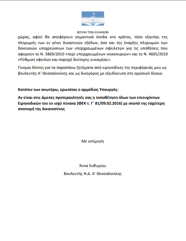 Γίνομαι δέκτης για τα παραπάνω ζητήματα από ειρηνοδίκες της περιφέρειάς μου ως βουλευτής Α’ Θεσσαλονίκης και ως δικηγόρος με εξειδίκευση στο εργατικό δίκαιο.